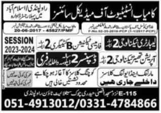 Admissions in Kamyab Institute of Medical Sciences 2023 for Laboratory Technology, Pharmacy Technician, Operation Theatre Technology, Dispenser has been announced. Eligible students can apply for academic admissions 2023 in Kamyab Institute of Medical Sciences Rawalpindi Punjab Pakistan for Medical College. Students for admissions in Diploma & criteria can apply as per Private institute admission policy 2023 before closing date August 12, 2023 as per advertisement. Read newspaper ad for exact details.