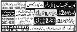 Kamyab Institute of Medical Sciences Laboratory Technology, Pharmacy Technician, Operation Theater Technology, Dispenser admissions 2023 has been announced. Students can enroll for admissions in Kamyab Institute of Medical Sciences Wah Cantt Punjab Pakistan for academic year 2023 to continue campus based or online education in Medical College. Eligible candidates for admissions in Diploma can apply as per Private institute criteria and before closing date 19 December 2023 after reading advertisement online. Read newspaper ad for exact details.