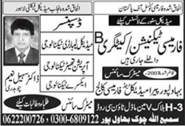 Bahawalpur Paramedical & Pharmacy College has announced admissions 2023 for Pharmacy Technician, Dispenser, Medical Laboratory Technology, Operation Theatre Technology, XRay Technology. Bahawalpur Paramedical & Pharmacy College Bahawalpur Punjab Pakistan welcomes students to apply for admissions in academic year 2023 in Medical College. Eligible students for fulfilling criteria for admissions in Diploma can enroll as per Private admission policy 2023 till closing date 26 March 2023. Read newspaper ad for exact details.