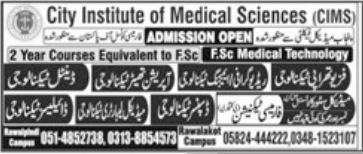 City Institute of Medical Sciences CIMS admissions 2023 for Physiotherapy Technology, Radiography and Imaging Technology, Operation Theatre Technology, Dental Technology, Pharmacy Technician, Dispenser Technology, Medical Laboratory Technology, Dialysis Technology has been announced. Students who want to take admissions in City Institute of Medical Sciences CIMS Rawalakot AJK Pakistan for academic year 2023 to continue education in Medical Diploma can apply. Students who want to enroll for academic session 2023 in Diploma qualification and admission criteria for Private institute can apply till last date 17 October 2023. Read newspaper ad for exact details.