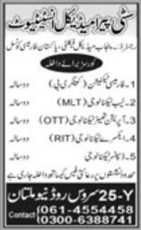 City Paramedical Institute CPI admissions 2024 for Pharmacy Technician, Lab Technology, Operation Theater Technology, Xray Technology, Dispenser Technology has been announced. City Paramedical Institute CPI Multan Punjab Pakistan welcomes students to apply for admissions in academic year 2024 in Medical College. Students for admissions in Diploma can apply for online or campus classes as per Private institute criteria till admission closing date January 31, 2024. Read newspaper ad for exact details.