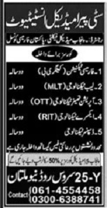 City Paramedical Institute CPI Pharmacy Technician, Lab Technology, Operation Theatre Technology OTT, XRay Technology, Dispenser Technology admissions 2024 has been announced. City Paramedical Institute CPI Multan Punjab Pakistan welcomes students to apply for admissions in academic year 2024 in Medical Diploma. Eligible students for fulfilling criteria for admissions in Diploma can enroll as per Private admission policy 2024 till closing date 23 December 2024. Read newspaper ad for exact details.