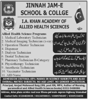 Jinnah Jam e School and College Medical Laboratory Technician, Medical Imaging Technician, Operation Theatre Technician, Dispenser, Dialysis Technician, Dental Technician, Pharmacy Technician, Physiotherapy Technician, Anesthesia Technician, Vaccinator Technician, AID Nurse admissions 2023 has been started. Eligible students who qualify as per admission criteria in Jinnah Jam e School and College Islamabad Islamabad Pakistan can apply in Medical College for academic year 2023. Eligible students for fulfilling criteria for admissions in Diploma can enroll as per Private admission policy 2023 till closing date 13 September 2023. Read newspaper ad for exact details.