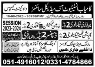 Kamyab Institute of Medical Sciences admissions 2023 for Laboratory Technology, Pharmacy Technician, Operation Theatre Technology, Dispenser has been announced. Eligible students who qualify as per admission criteria in Kamyab Institute of Medical Sciences Wah Cantt Punjab Pakistan can apply in Medical College for academic year 2023. Students for admissions in Diploma & criteria can apply as per Private institute admission policy 2023 before closing date May 16, 2023 as per advertisement. Read newspaper ad for exact details.