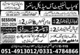 Kamyab Institute of Medical Sciences admissions 2023 for Laboratory Technology, Pharmacy Technician, Operation Theatre Technology, Dispenser has been announced. Eligible students can apply for academic admissions 2023 in Kamyab Institute of Medical Sciences Rawalpindi Punjab Pakistan for Medical College. Students who want to enroll for academic session 2023 in Diploma qualification and admission criteria for Private institute can apply till last date 27 September 2023. Read newspaper ad for exact details.