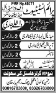 Prime Institute Paramedical and Health Sciences Medical Laboratory Technology, Operation Theatre Technology, Dispenser, Assistant Pharmacist admissions 2023 has been announced. Eligible students can apply for academic admissions 2023 in Prime Institute Paramedical and Health Sciences Rahim Yar Khan Punjab Pakistan for Medical Diploma. Eligible candidates for admissions in Diploma can apply as per Private institute criteria and before closing date 3 October 2023 after reading advertisement online. Read newspaper ad for exact details.
