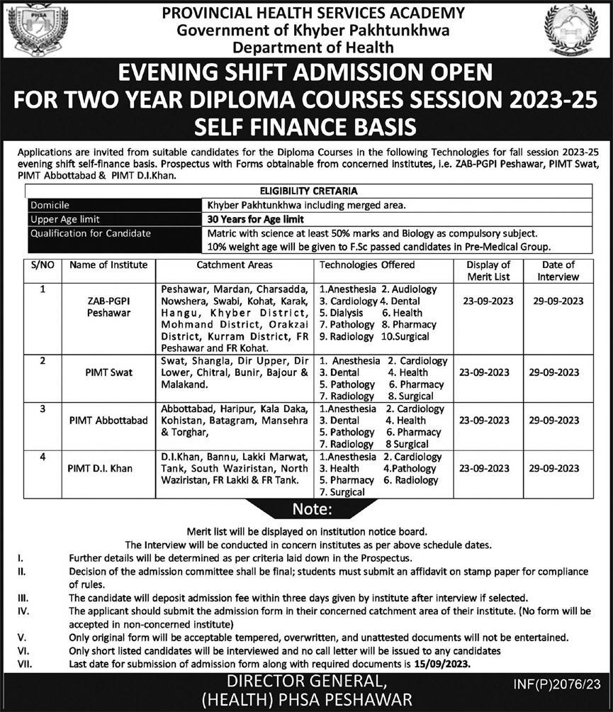 Provincial Health Services Academy Medical Diploma Programs admissions 2023 has been announced. Students who want to take admissions in Provincial Health Services Academy Peshawar Khyber Pakhtunkhwa KPK Pakistan for academic year 2023 to continue education in Medical Diploma can apply. Students for admissions in Diploma & criteria can apply as per Government institute admission policy 2023 before closing date September 15, 2023 as per advertisement. Read newspaper ad for exact details.