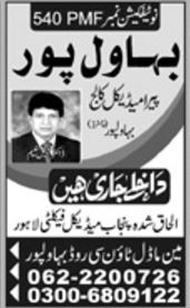 Bahawalpur Paramedical & Pharmacy College has announced admissions 2024 for Medical Diploma Programs. Students who want to take admissions in Bahawalpur Paramedical & Pharmacy College Bahawalpur Punjab Pakistan for academic year 2024 to continue education in Medical Diploma can apply. Eligible candidates for admissions in Diploma can apply as per Private institute criteria and before closing date 16 December 2024 after reading advertisement online. Read newspaper ad for exact details.