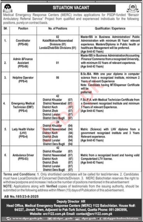 Medical Emergency Response Centers MERC 1122 jobs advertisement dated about 24 August 2025 in daily Jang Newspaper invites application for the vacant post of Emergency Medical Technician Emt, Helpline Operator, Coordinator, Lady Health Visitor, Admin Finance Assistant and Ambulance Driver in Quetta, quetta Balochistan Pakistan. Educational qualifications required Bachelor, Matric, MS and Master etc.