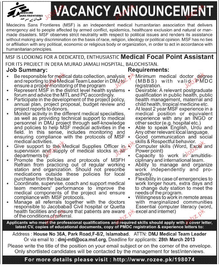 Apply as per details in job advertisement. Login to view further details of how to apply via https://www.jobz.pk online.