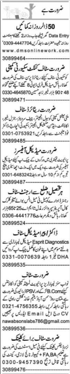 Private Company Lahore, lahore Punjab Pakistan invites applications from eligible candidates for the post of office boy, accountant, security incharge, mechanical engineer, public relation officer, pro, helper, chief surveyor, supervisor, paramedical staff, civil engineer, clerk, female assistant, data entry operator, accounts assistant, doctor, psv driver, security guard, medical officer, security staff, call operator, engineer, general manager, driver, admin manager, manager and assistant as per advertisement of November 13, 2024 published in daily Express Newspaper. Educational qualifications required ACCA, MBBS, B.com, DAE, Matric, BA, Middle, Intermediate and Bachelor etc.