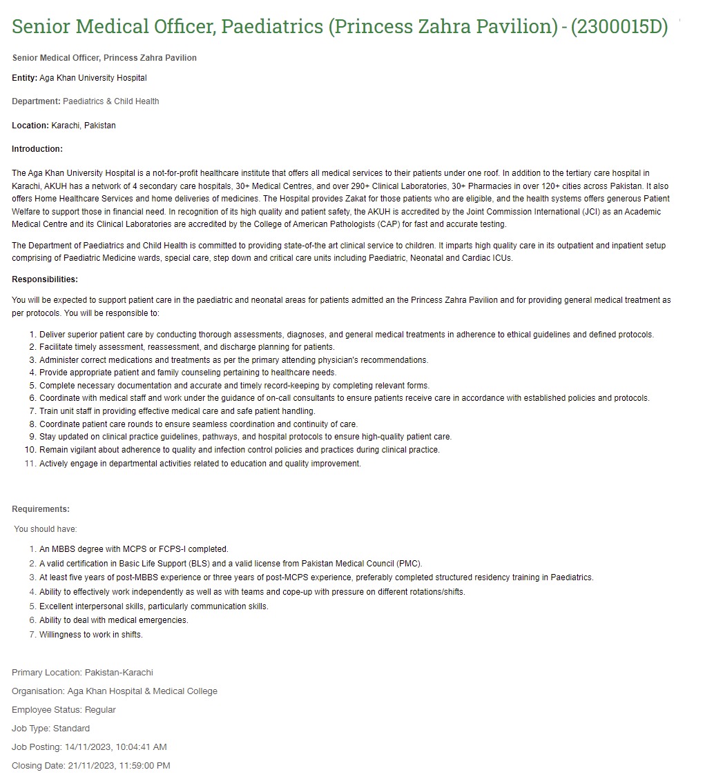 Latest Medical jobs and others Private jobs in Aga Khan University Hospital closing date is around November 21, 2023, see exact from ad. Read complete ad online to know how to apply on latest Aga Khan University Hospital job opportunities.