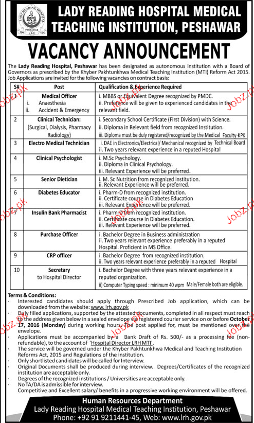 Medical Officers, Clinical Technicians, Medical Technicians, Senior Dieticians, Purchase Officers, CRP Officers and Secretary are required in Lady Reading Hospital in Peshawar.