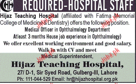 Medical Officers are required in Hijaz Teaching Hospital in Lahore