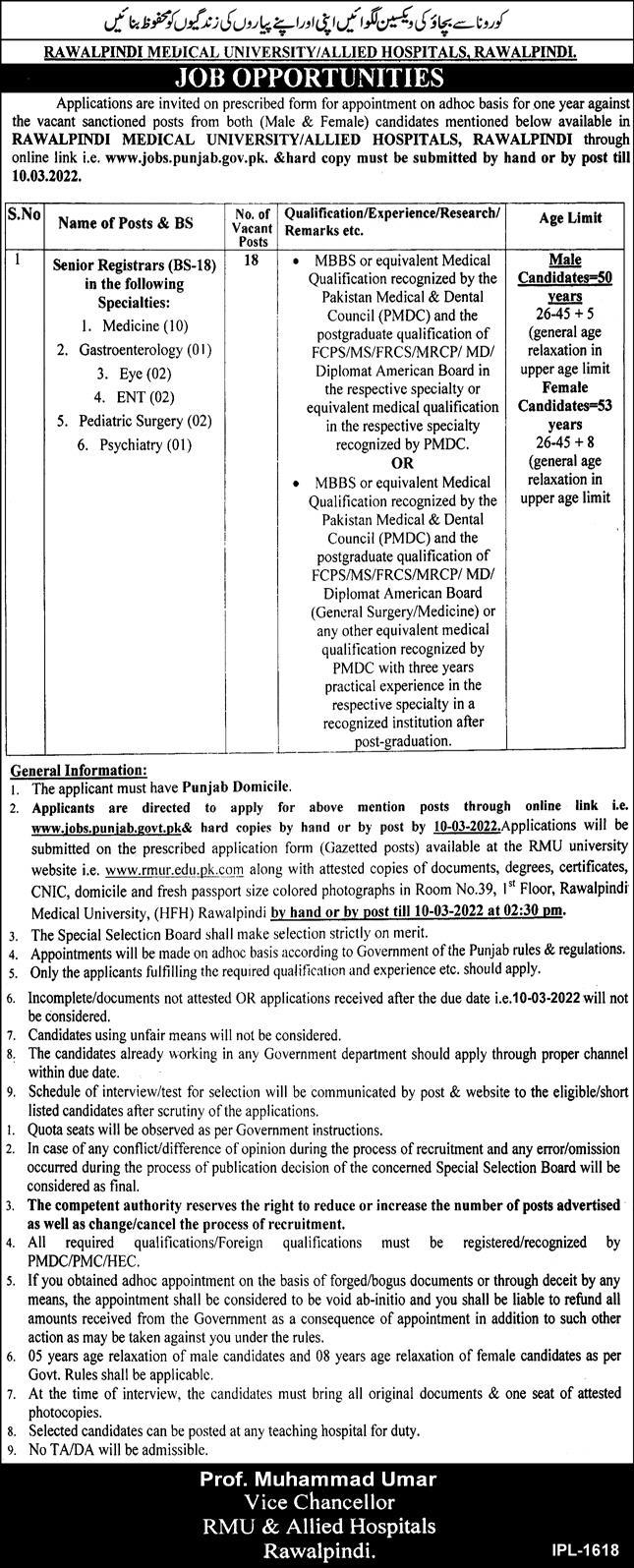 Rawalpindi Medical University RMU Rawalpindi Punjab Pakistan invites applications from eligible candidates for the post of psychiatry registrar, ent registrar, gastroenterology registrar, registrar, eye registrar, pediatric surgery registrar and medicine registrar as per advertisement of February 13, 2022 published in daily Express Newspaper. MBBS and Others etc. educational qualification will be preferred.