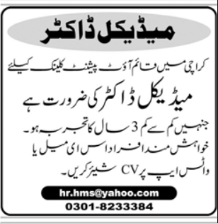 Hospital Clinic jobs advertisement dated about 7 August 2022 in daily Jang Newspaper invites application for the vacant post of medical doctor and doctor in Karachi, karachi Sindh Pakistan. Educational qualifications required MBBS etc.