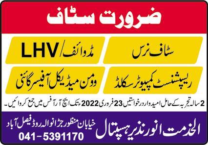 Al Khidmat Anwar Nazir Hospital is looking for candidates for following posts as per job advertisement published in daily Express Newspaper of February 18, 2022 for location Faisalabad Punjab Pakistan: