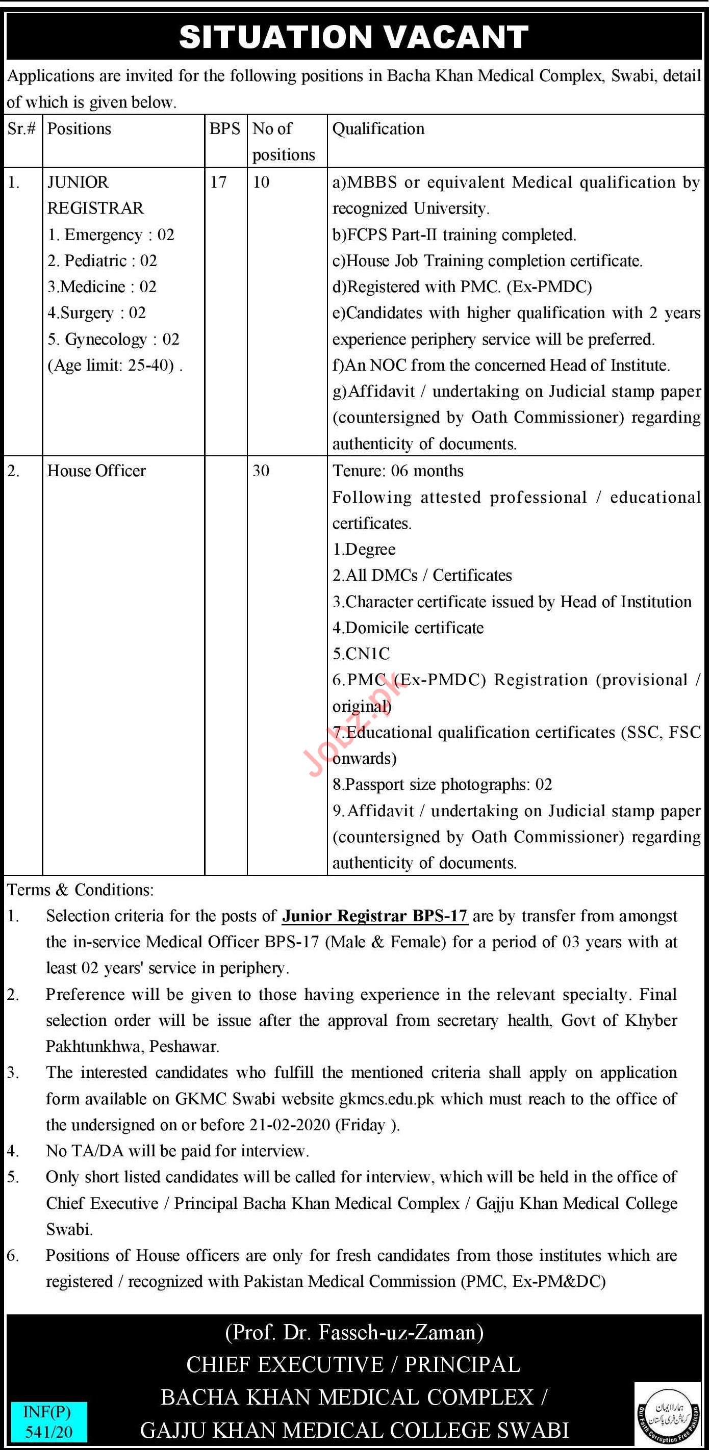Bacha Khan Medical Complex invites applications from highly educated expert and experienced professionals for the post of Registrar, Emergency Registrar, Pediatric Registrar, Medicine Registrar, Surgery Registrar, Gynecology Registrar, Medical House Officer in Swabi.