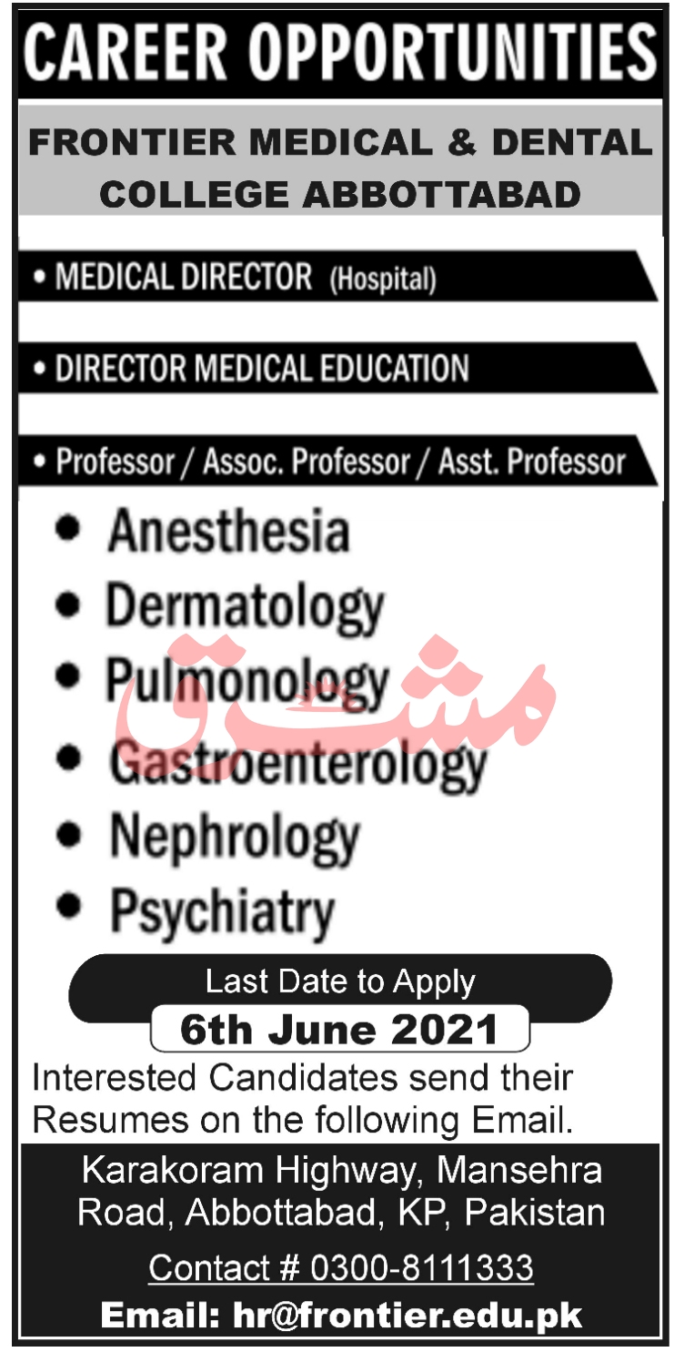 Vacancies in Frontier Medical & Dental College Advertisement May 2021
