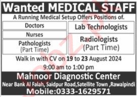 Mahnoor Diagnostic Center Rawalpindi, rawalpindi Punjab Pakistan invites applications from eligible candidates for the post of radiologist, nurse, mbbs doctor, pathologist, lab technologist and doctor as per advertisement of August 18, 2024 published in daily Jang Newspaper. MBBS, Intermediate, Master and Bachelor etc. educational qualification will be preferred.