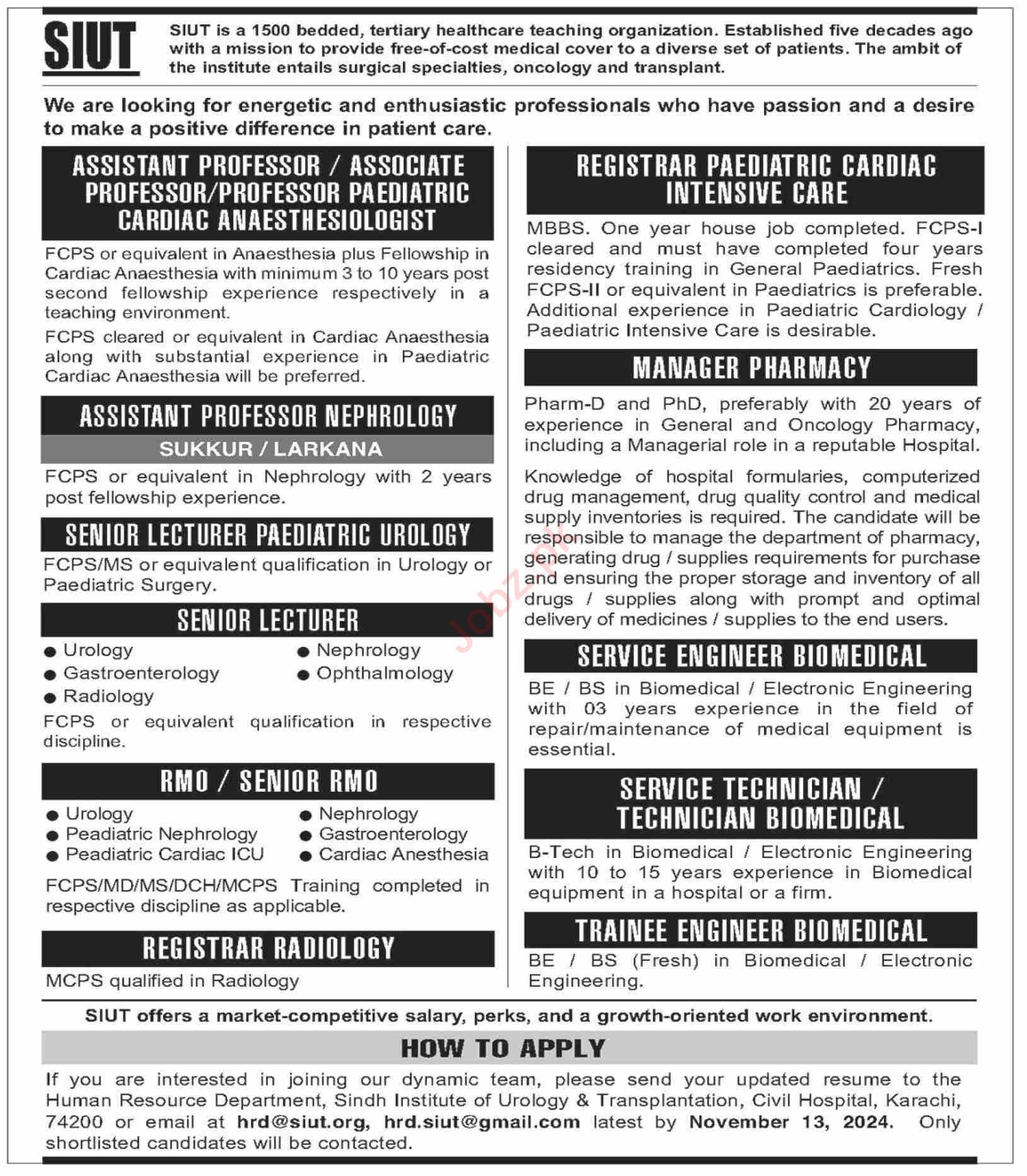 Sindh Institute of Urology and Transplantation SIUT invites applications for job positions advertised in daily Dawn dated 3 November 2024 for following vacancies in Karachi, karachi Sindh Pakistan.