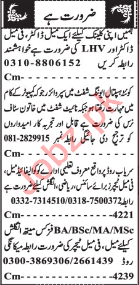 Medical Officer, Radiologist, Nurse, LHV, Doctor, Lady Doctor, Teacher, Chemistry Teacher, Physics Teacher, School Administrator, School Counselor, School Librarian, Pharmacist, Midwife, Gynecologist, Receptionist, Dispenser seeks in well reputed schools and hospitals.