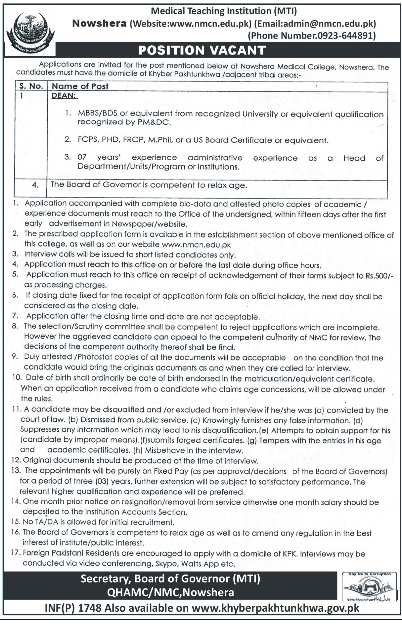 Medical Teaching Institute MTI Nowshera Jobs 2018