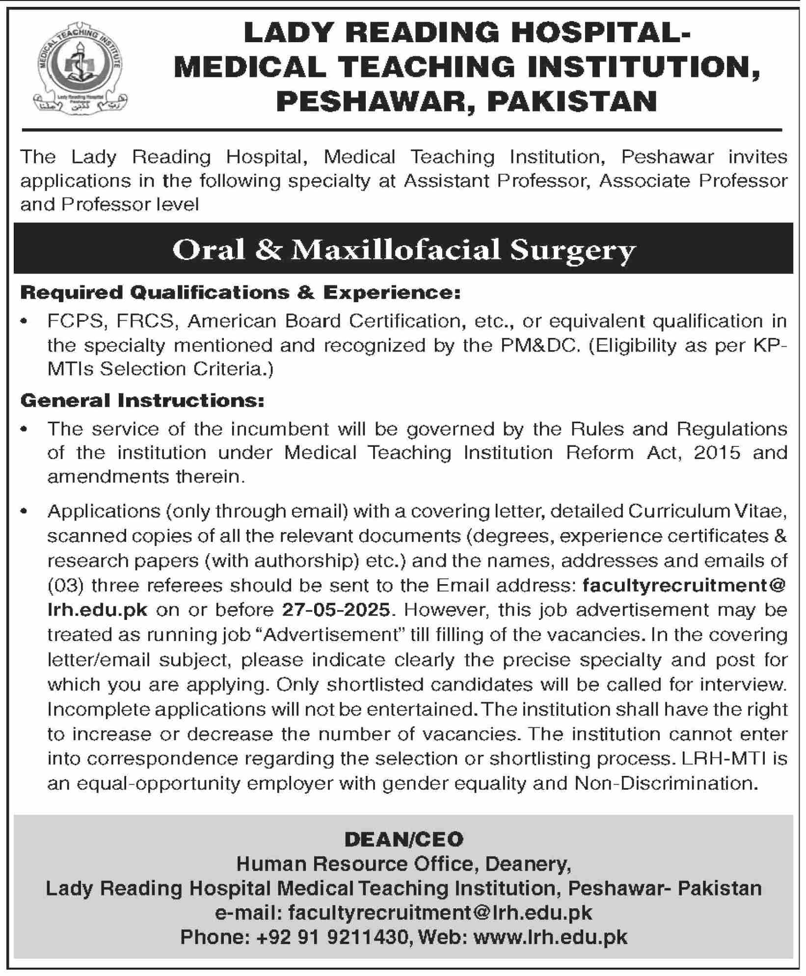 Vacant posts including professor, assistant professor, professor oral maxillofacial surgery and associate professor are announced in Medical Teaching Institution MTI GT Road Peshawar, peshawar Khyber Pakhtunkhwa KPK Pakistan as per 14 May 2025 advertisement in daily Dawn Newspaper. Candidates with Others and MBBS etc. educational background will be preferred.