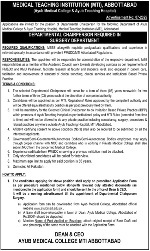 Medical Teaching Institution MTI Abbottabad, abbottabad Khyber Pakhtunkhwa KPK Pakistan invites applications from eligible candidates for the post of chairperson as per advertisement of March 28, 2025 published in daily Mashriq Newspaper. Bachelor, Master, Mphil and Phd etc. educational qualification will be preferred.