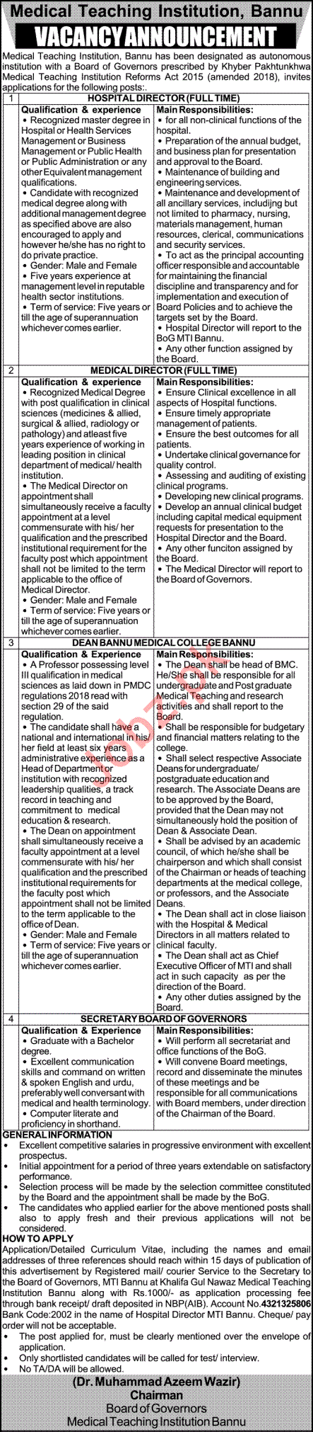 Vacancies in Medical Teaching Institution MTI Advertisement April 2019