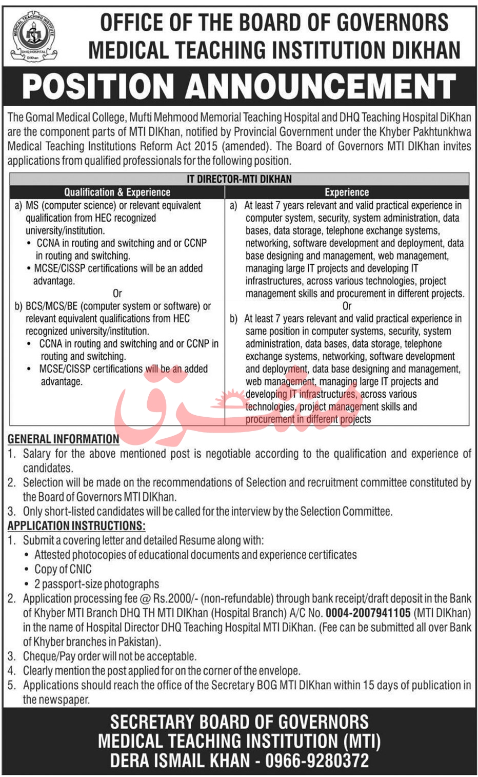 Vacant posts including it director are announced in Medical Teaching Institution MTI Dera Ismail Khan, dera ismail khan Khyber Pakhtunkhwa KPK Pakistan as per 2 July 2025 advertisement in daily Mashriq Newspaper. Candidates with Bachelor, MS and Master etc. educational background will be preferred.