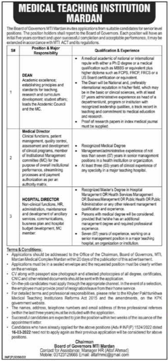 Medical Teaching Institution MTI jobs advertisement dated about 16 September 2022 in daily Mashriq Newspaper invites application for the vacant post of hospital director, medical director and dean in Mardan, mardan Khyber Pakhtunkhwa KPK Pakistan. Educational qualifications required Others, Phd and MBBS etc.