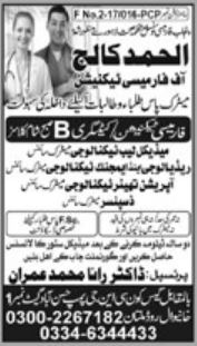 Al Hamd College admissions 2022 for Pharmacy Technician, Medical Lab Technology, Radiology and Imaging Technology, Operation Theater Technology, Dispenser has been announced. Al Hamd College Multan Punjab Pakistan welcomes students to apply for admissions in academic year 2022 in Medical College. Students for admissions in Course and Diploma & criteria can apply as per Private institute admission policy 2022 before closing date August 24, 2022 as per advertisement. Read newspaper ad for exact details.