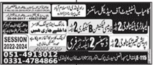 Kamyab Institute of Medical Sciences admissions 2023 for Laboratory Technician, Pharmacy Technician, Operation Theatre Technology, Dispenser has been announced. Eligible students can apply for academic admissions 2023 in Kamyab Institute of Medical Sciences Rawalpindi Punjab Pakistan for Medical College. Students for admissions in Diploma & criteria can apply as per Private institute admission policy 2023 before closing date February 8, 2023 as per advertisement. Read newspaper ad for exact details.