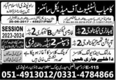 Admissions in Kamyab Institute of Medical Sciences 2023 for Laboratory Technology, Pharmacy Technician, Operation Theatre Technology, Dispenser, has been announced. Eligible students who qualify as per admission criteria in Kamyab Institute of Medical Sciences Rawalpindi Punjab Pakistan can apply in Medical College for academic year 2023. Students for admissions in Diploma & criteria can apply as per Private institute admission policy 2023 before closing date February 28, 2023 as per advertisement. Read newspaper ad for exact details.
