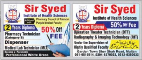 Sir Syed Institute of Health Sciences admissions 2023 for Pharmacy Technician, Dispenser, Medical Lab Technician, Operation Theatre Technician OTT, Radiography and Imaging Technology has been announced. Students can enroll for admissions in Sir Syed Institute of Health Sciences Multan Punjab Pakistan for academic year 2023 to continue campus based or online education in Medical College. Students for admissions in Diploma can apply for online or campus classes as per Private institute criteria till admission closing date March 19, 2023. Read newspaper ad for exact details.