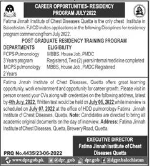 Fatima Jinnah Institute of Chest Diseases jobs advertisement dated about 24 June 2022 in daily Jang Newspaper invites application for the vacant post of fcps pulmonology trainee in Quetta, quetta Balochistan Pakistan. Preferred Education is MBBS etc.