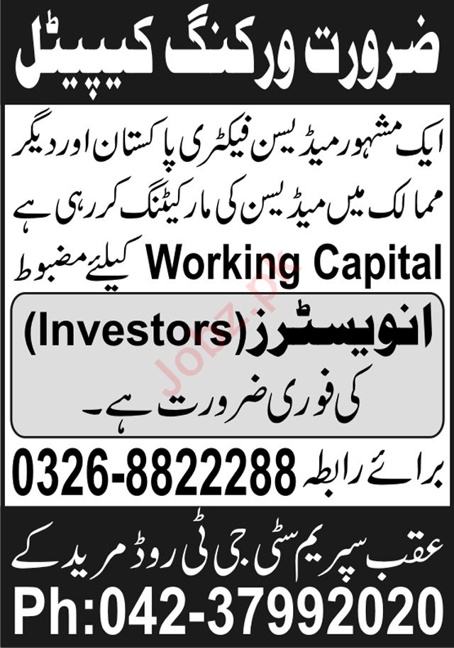 Vacant posts including investor are announced in Private Company Muridke, muridke Punjab Pakistan as per 28 August 2022 advertisement in daily Nawaiwaqt Newspaper. Candidates with Master and Bachelor etc. educational background will be preferred.