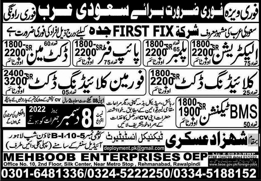 Mehboob Enterprises Overseas Employment Promoters jobs advertisement dated about 4 December 2022 in daily Express Newspaper invites application for the vacant post of plumber, pipe fitter, foeman cladding docket, cladding docketman, electrician and docket man in Riyadh, riyadh Saudi Arabia. Persons with Primary, Middle and Matric etc. education can apply.