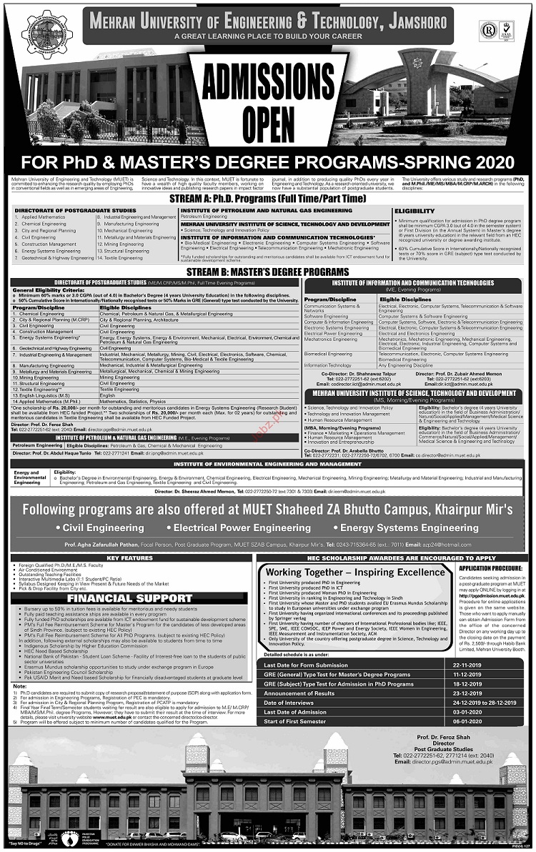 Mehran University of Engineering & Technology has announced admissions in PhD Applied Mathematics, PhD Chemical Engineering, PhD Civil Engineering, PhD Construction Management, PhD Energy Systems Engineering, PhD Manufacturing Engineering, Masters in Chemical Engineering, Civil Engineering, Construction Engineering, Energy Systems Engineering, Construction Management, Energy System Engineering, Geotechnical and Highway Engineering, Manufacturing Engineering, Mining Engineering, Structural Engineering, Textile Engineering, English Linguistics, Applied Mathematics in Jamshoro, Sindh. Read newspaper ad for exact details.