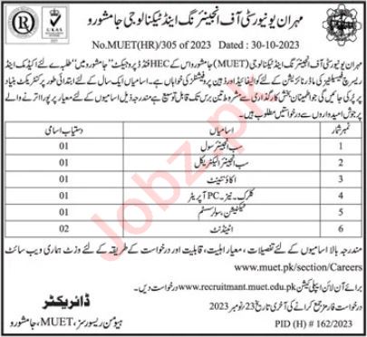 Mehran University of Engineering & Technology is looking for candidates for following posts as per job advertisement published in daily Jang Newspaper of November 5, 2023 for location Jamshoro, jamshoro Sindh Pakistan: