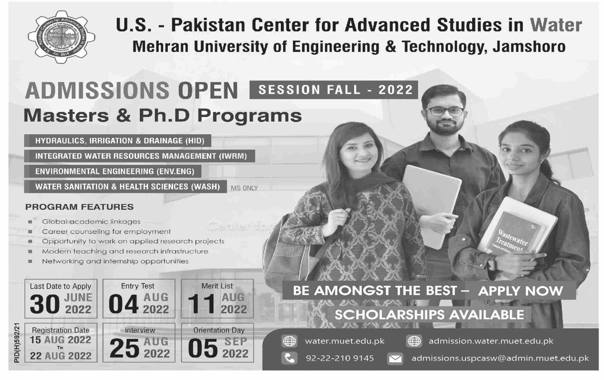 Mehran University of Engineering & Technology has announced admissions 2022 for Masters & PhD Programs, Hydraulics Irrigation & Drainage, Integrated Water Resources Management, Environmental Sciences, Water Sanitation & Health Sciences. Eligible students who qualify as per admission criteria in Mehran University of Engineering & Technology Jamshoro Sindh Pakistan can apply in Teaching University for academic year 2022. Students for admissions in Phd and Master & criteria can apply as per Government institute admission policy 2022 before closing date June 30, 2022 as per advertisement. Read newspaper ad for exact details.