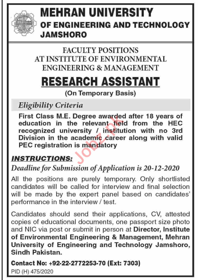 Vacancies in Mehran University of Engineering & Technology Advertisement December 2020