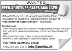 Vacant posts including sales manager are announced in Mehta Brothers Pvt Limited Islamabad, islamabad Islamabad Pakistan as per 15 May 2022 advertisement in daily Jang Newspaper. Persons with Master and Bachelor etc. education can apply.