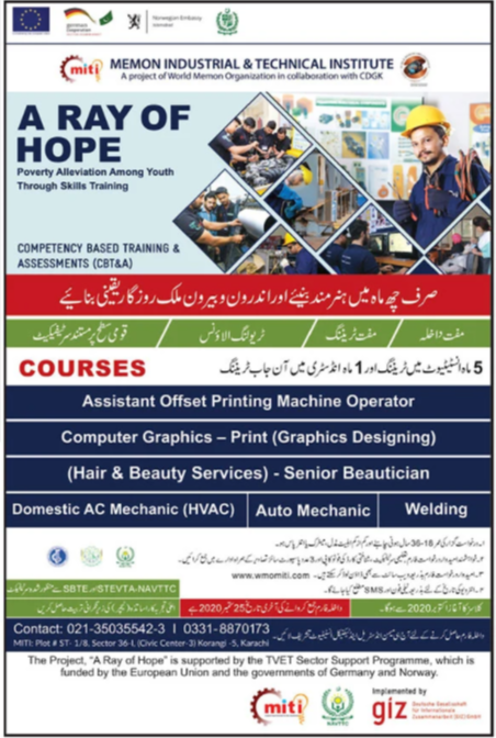 Memon Industrial & Technical Institute MITI is offering admissions for courses in Assistant Offset Printing Machine Operator, Computer Graphics - Print, Graphic Designing, Senior Beautician, Domestic AC Mechanic HVAC, Auto Mechanic, Welding. Read newspaper ad for exact details.