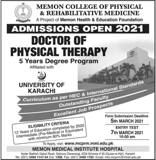 Memon Medical Institute Hospital, Memon College of Physical & Rehabilitative Medicine has announced admissions in Doctor of Physical Therapy DPT 5 Years Degree Program 2021. Read newspaper ad for exact details.