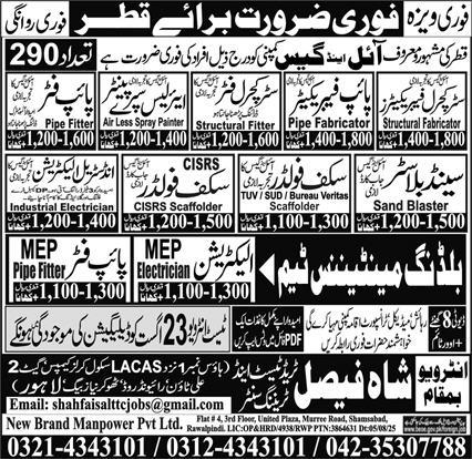 Shah Faisal Trade Test & Training Center invites applications for job positions advertised in daily Express dated 21 August 2025 for following vacancies in Doha, doha Qatar.