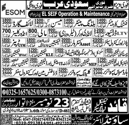 Quaid Technical Training Center is looking for candidates for following posts as per job advertisement published in daily Express Newspaper of November 20, 2025 for location Jeddah, dammam Saudi Arabia: