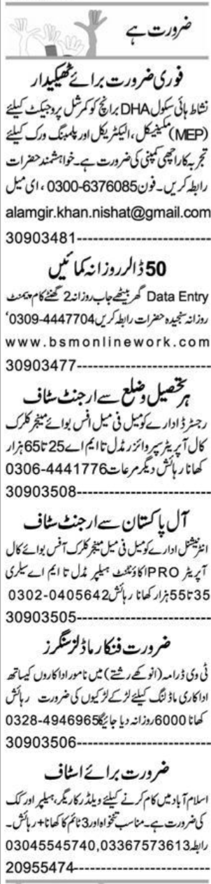 Private Company jobs advertisement dated about 19 December 2024 in daily Express Newspaper invites application for the vacant post of electrical technician, manager, welder, husband wife, call operator, mechanical technician, factory worker, driver, singer, model, clerk, kitchen helper, accountant, actor, data entry operator, patient care, helper, mep technician, public relations officer, pro, office boy, supervisor and cook in Multan, multan Punjab Pakistan. Candidates with BA, Middle, Matric, DAE, Intermediate, Bachelor and B.com etc. educational background will be preferred.