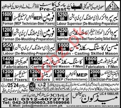 A well progressive and fast growing company located in Saudi Arabia is seeking from services from experienced and committed candidates for the posts of Labor Supervisor, MEP Technician, Steel Fixer, Foreman, Supervisor, Fabricator, Mason, Labor, Electrician, Erector.